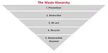As the hierarchy shows, prevention in the first place has the most effect, followed by reduction, reuse and recycling. Putting in place the first four steps significantly reduces the need for the final step, responsible disposal: