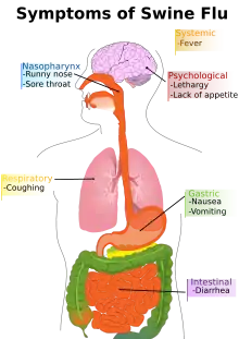 According to the Centers for Disease Control and Prevention (CDC), in humans the symptoms of the 2009 "swine flu" H1N1 virus are similar to those of influenza and of influenza-like illness in general. Symptoms include fever, cough, sore throat, body aches, headache, chills and fatigue. The 2009 outbreak has shown an increased percentage of patients reporting diarrhea and vomiting.[74] The 2009 H1N1 virus is not zoonotic swine flu, as it is not transmitted from pigs to humans, but from person to person.