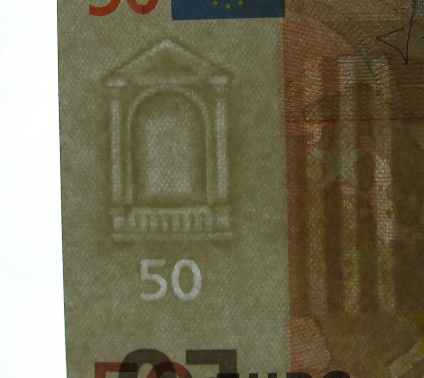 When the banknote is tilted, either the euro symbol or the value numeral (5, 10 or 20) - depending on the viewing angle - appears as a hologram with shifting colours on €5, €10 and €20, or either the value numeral or the architectural motif - depending on the viewing angle - appears as a hologram with shifting colours on (€50, €100, €200 and €500). When held up to the light, a closer look at the foil stripe reveals a euro symbol in the foil perforations.