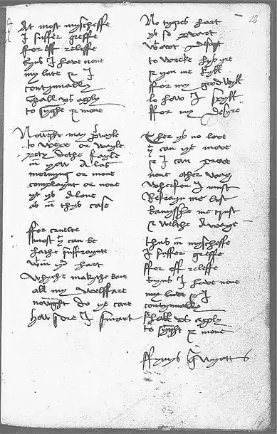 Attributed to Sir Thomas Wyatt[2] in the Devonshire Manuscript, this poem was entered by H2. Similar to other courtly poetry found in the Devonshire Manuscript, this poem describes a suffering lover and his cruel mistress.