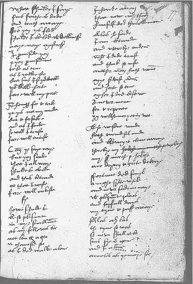 Attributed to Sir Thomas Wyatt,[1] this poem was entered by H8. The speaker recounts how he met a lamenting lover. In the end, the lover hopes the speaker will be more wary in his trust or else he will sing the same song. Rebholz notes that the poem belongs to the medieval French genre chanson à personnages (dramatic song) wherein the poet listens to a young woman's complaint.[2]