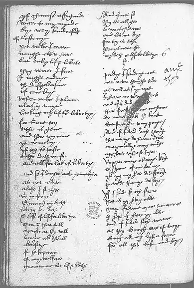 Attributed to Sir Thomas Wyatt,[1] this poem was entered by H8. R. A. Rebholz notes that the poem's interpretation depends on three different meanings of "life" and "liberty"; if a reader interprets the poem as the speaker's complaint to a lady for rejecting his love, "life" and "liberty" signify a renewed vitality when the speaker gains freedom to declare his love—thus enabling him to maintain his strength if she rejects him. "Life" and "liberty" may also signify the speaker's freedom from loving the lady. Alternatively, if a reader interprets the poem politically, "life" and "liberty" may represent the speaker's freedom from restraint or imprisonment.[2]