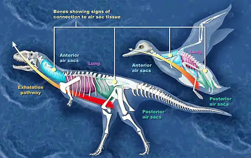 When comparing our respiratory system to that of a bird, there are some very distinct differences. The most notable of which is the fact that along with having lungs, birds also have air sacs, which extend into the humerus (the bone between the shoulder and elbow), the femur, the vertebrae and even the skull. Birds do not have a diaphragm, instead, they move air in and out of there respiratory system via pressure changes in the air sacs.