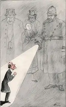 McKenna became President of the Board of Education in 1907 (shortly after his first appearance in Vanity Fair) and First Lord of the Admiralty in 1908, from which position as “a staunch disciple of Dilke’s naval policy” he promoted the buildup of the British fleet, which proved prescient for the 1914-18 war. In 1911 he moved to Asquith’s Home Office where in 1913 he had to decide whether to force-feed imprisoned women suffragists or let them starve to death, a Hobson’s choice he attempted to resolve by seeking and obtaining passage of the “Prisoners (Temporary Discharge for Ill-Health) Act, 1913.” Generally known as the “Cat and Mouse Act,” the law gave McKenna discretion to “license out” prisoners who were close to starvation (so that any continuation of their hunger strike was on their own heads), but also to revoke parole promptly for any new offense. It pleased hardly anyody: neither the suffragists, for it did not give them the right to vote and weakened the political impact of their in-prison hunger strikes; nor did it please their opponents, who viewed early release on these grounds as an affront to law and order. McKenna’s second appearance in Vanity Fair dates to that episode, in which the magazine, by then under Allinson’s uninspired hand and destined for absorption into Hearth and Home, came down vitriolically for the suffragists.