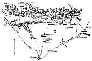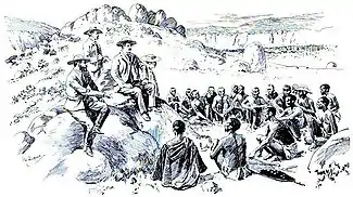 Following the end of the war, one of Lobengula's izinDuna said that just before Forbes' column had reached the Shangani on 3 December 1893, the king had attempted to buy the pioneers off. According to this story, two Matabele messengers, Petchan and Sehuloholu, had been given a box of gold sovereigns, and instructed to intercept the column before it reached the river. They were to tell the whites that the king admitted defeat, and offered this money in tribute if the BSAP would turn back.[4] "Gold is the only thing that will stop the white men," Lobengula reportedly said.[5] Petchan and Sehuloholu reportedly reached the column on 2 December 1893, and gave the money and the message to two men in the rear guard. No man who had been attached to the column confirmed this, but company authorities thought it unlikely that the Matabele would simply invent such a story.[4] Two officers' batmen were accused of accepting the gold, then keeping it for themselves and not passing on the message. The evidence against them was inconclusive, but they were found guilty and sentenced to 14 years' hard labour by the Resident Magistrate.[4] They were released after two years, however, because the maximum term the Magistrate could give was three months; the convictions were ultimately quashed altogether on a re-assessment of the evidence by the High Commissioner's legal team.[6] The truth of the matter has never been conclusively resolved.[4]