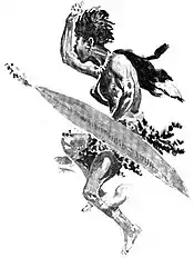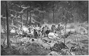 Once Mlimo started his dance of immunity, Burnham shot him just below the heart, killing him.[15][16] The two men then leapt over the dead Mlimo and ran down a trail towards their horses. Hundreds of warriors, encamped nearby, picked up their arms and started in pursuit. Burnham set fire to the village as a distraction. The two men hurried back to Bulawayo, with warriors in pursuit[14]