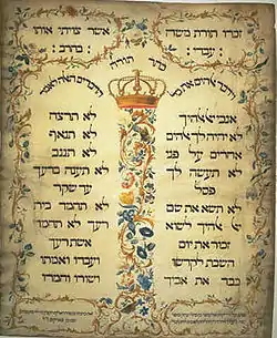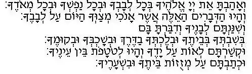 Moses imparted God’s instruction, the Shema and V'ahavta, saying: “Hear, O Israel: the Lord our God, the Lord is one. And you shall love the Lord your God with all your heart, and with all your soul, and with all your might. And these words, which I command you this day, shall be upon your heart; and you shall teach them diligently to your children, and shall talk of them when you sit in your house, and when you walk by the way, and when you lie down, and when thou rise up. And you shall bind them for a sign upon your hand, and they shall be for frontlets between your eyes. And you shall write them upon the doorposts of your house, and upon your gates.”[8]