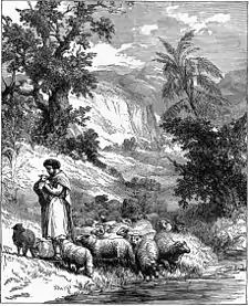 Jacob came to an eastern land where he saw a well with a great stone rolled upon it and three flocks of sheep lying by it. Jacob asked the men where they were from, and they said Haran. Jacob asked them if they knew Laban, and they said that they did. Jacob asked if Laban was well, and they said that it was, and that his daughter Rachel was coming with his sheep. Jacob told the men to water and feed the sheep, but they replied that they could not do so until all the flocks had arrived. When Jacob saw Rachel arrive with her father's sheep, he rolled the stone from the well's mouth, and watered Laban’s sheep. Jacob kissed Rachel, wept, and told her that he was her kinsman, and she ran and told her father.
