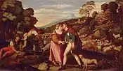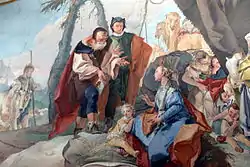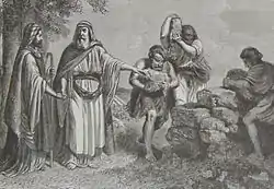 So Jacob set his sons and his wives on camels and headed out toward Isaac and Canaan with all the animals and wealth that he had collected in Padan-aram. Jacob tricked Laban by fleeing secretly while Laban was out shearing his sheep, and Rachel stole her father’s idols. On the third day, Laban heard that Jacob had fled and he and his kin pursued after Jacob seven days, overtaking him in the mountain of Gilead. God came to Laban in a dream and told him not to speak to Jacob either good or bad. But when Laban caught up with Jacob, he asked Jacob what he meant by carrying away his daughters secretly, like captives, without letting him kiss his daughters and grandchildren goodbye. Laban said that while he had the power to harm Jacob, God had told him the previous night not to speak to Jacob either good or bad, and now Laban wanted to know why Jacob had stolen his gods. Jacob answered that he fled secretly out of fear that Laban might take his daughters by force, and not knowing Rachel stole the gods, he told Laban that whoever had his gods would die. Laban searched Jacob's tent, Leah's tent, and the two maid-servants’ tent, finding nothing, and then he entered Rachel's tent. Rachel had hidden the idols in the camel’s saddle and sat upon them, apologizing to her father for not rising, as she was having her period. Laban searched and felt about the tent, but did not find the idols. Angered, Jacob questioned Laban what he had done to deserve this hot pursuit and this searching. Jacob protested that he had worked for Laban for 20 years, through drought and frost, bearing the loss of animals torn by predators, and not eating Laban’s rams, only to have his wages changed 10 times. Had not the God of Isaac been on Jacob’s side, surely Laban would have sent Jacob away empty, Jacob said, and God had seen his affliction and awarded him what he deserved. Laban answered Jacob that they were his daughters, his children, and his flocks, but asked what he could do about it now.