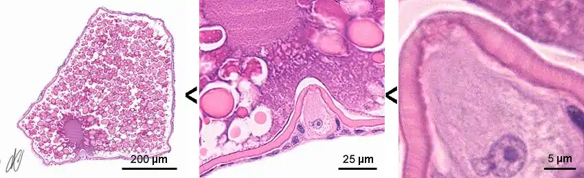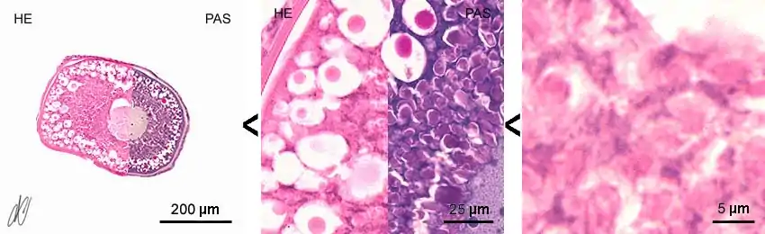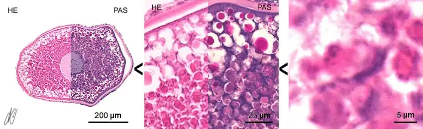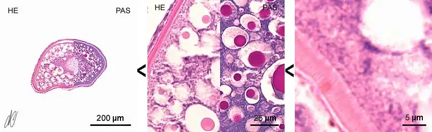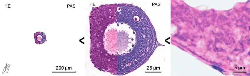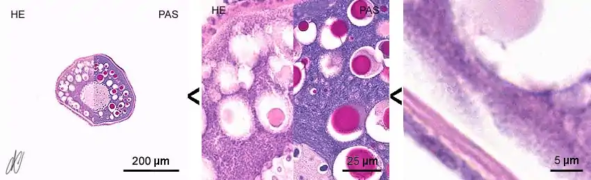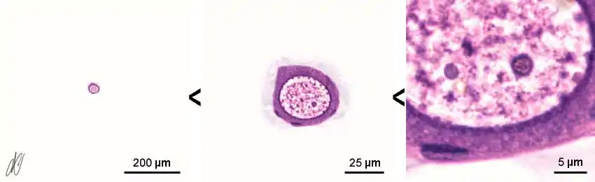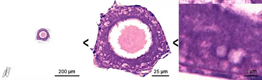 Various systems have been proposed to stage oocyte growth. Such classifications take into account morphological features of the growing oocyte and its nucleus, oocyte size, and granulosa cell layer properties. The staging presented here is mainly descriptive, and is based on Lambert 1970 and Selman 1993. Classical staging terminology is given for comparison. references