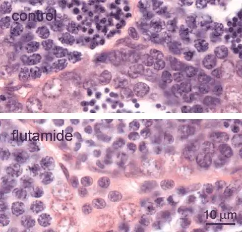 Adult male zebrafish, control (top), and exposed to 1 mg flutamide /L (bottom); H&E staining |