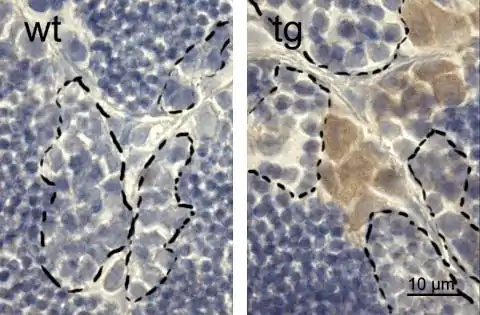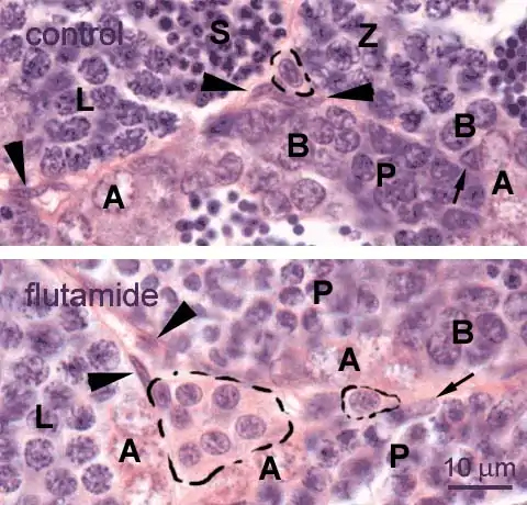Leydig cells [outlined], also known as interstital cells, are found in the interstitial space between the testis tubules. These cells have regularly shaped round or oval nuclei. In the control testis, they occur solitairy or in small clusters; larger clusters are observed after exposure to the anti-androgen flutamide, shown here [lower image] for comparison. Occasionally, such larger clusters may also be present at the periphery of the control testis.