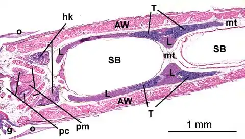 testis location, general structureThe testis [T] is a paired organ, located bilaterally between the abdominal wall [AW] and the swim bladder [SB]. At the level of this section, the testis is further bounded by the liver [L] and mesenchymal tissue [mt] (mainly adipose tissue); dorsally it is adjacent to the kidney and ventrally to the intestines (not visible on this level).