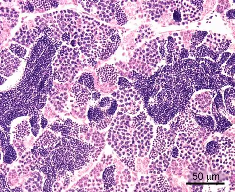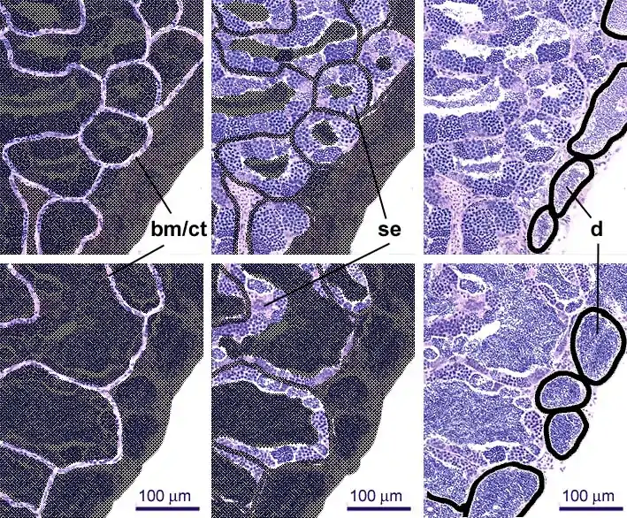 Note, that zebrafish have continuous reproduction, and therefore show a balanced presence of proliferating, differentiating, maturing spermatogenic stages, and mature sperm. In contrast, the testis of seasonal breeders shows predominance of one of these successive stages predominates; these testes may be classified accordingly. |