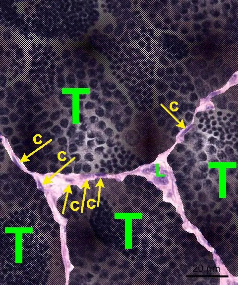The seminiferous tubules [T] are separated by thin strands of interstitial connective tissue [highlighted in right image]. This interstitial tissue contains connective tissue cells [c] and Leydig cells [L] (intermediate sized cells with a round-oval nucleus), which produce androgen when stimulated by the pituitary-derived gonadotropic hormone.