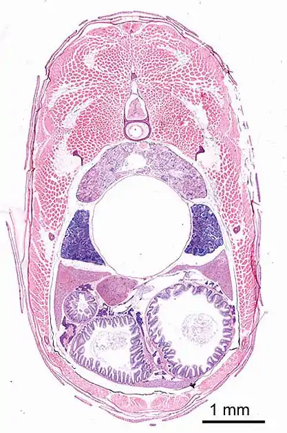 The axial section below of an adult male zebrafish is from the rostral part of the abdominal cavity, where the testis [T] is in the upper part, between swim bladder [sb] and abdominal wall. The area of testis will show largely similar in more caudal sections. The abdominal organs shown in this image are liver [L], pancreas [arrows], spleen [S], intestinal loops [I]. Major blood vessels in this section are dorsal aorta [upper arrow] and posterior cardinal vein [lower arrow], embedded in the kidney [k] intestinal arteries [arrows], intestinal veins [arrows] and epigastric vein [arrow], partly embedded in the liver. The horizontal skeletogenous septum [horizontal line] separates the epaxialis [em] and hypaxialis muscles [hm], which are inserted to this septum and to the spine [sp], and which are also bound to the skin. In the midline, the epaxial muscles insert to the vertical skeletogonous septum [vertical line]. Although organised in myotomes which are oriented perpendicular to the length axis of the fish, these muscles appear cross-sectioned due to their waved course [middle diagram]. The epaxialis includes the dorsal supracarinalis muscles [upper outline], the hypaxialis includes the ventral infracarinalis muscles [lower outline]. The lateralis superficialis muscles [left/right outlines] overlay the peripheral part of the horizontal septum. Pleural rib structures [arrows] can be observed within the hypaxialis. |