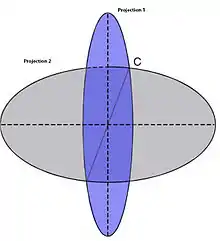 Two projection views of a molecule intersecting at a common line in Fourier space.