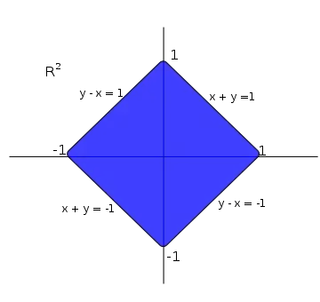 The Unit ball is a ball of radius 1. Lets view some examples of the unit ball of with different -norm induced metrics. The unit ball of with the norm is:
