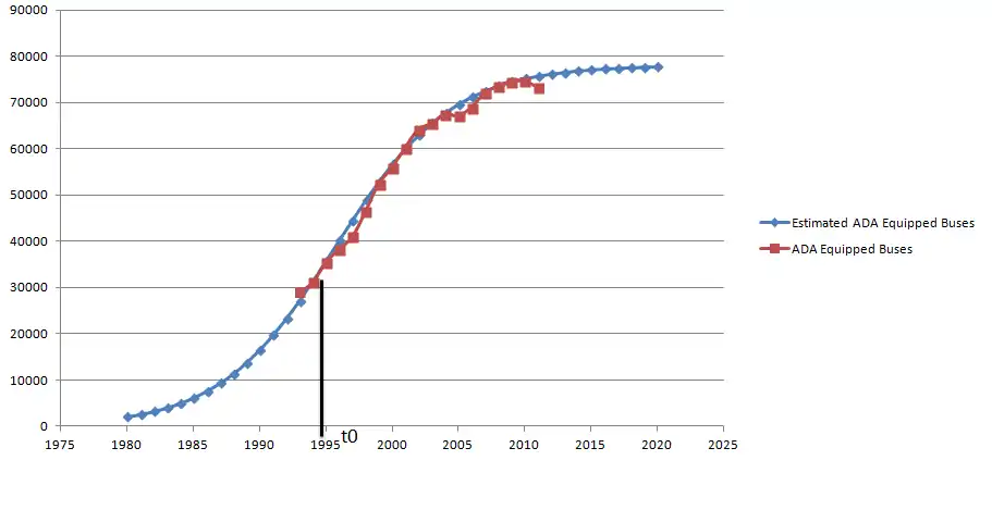 Using ADA transit bus statistics from the U.S. Department of Transportation, Federal Transit Administration, National Transit Summaries and Trends (Washington, Annual Issues), I found the number ADA lift and ramp-equipped transit buses from 1993-2011. Then, I predicted the amount of buses to be expected in a given year using the logistic equation