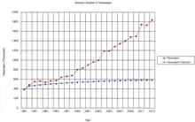The trending line for the tallied passengers and the predicted passengers both share an increasing demand. However the prediction is somewhat limited, compared to the relatively linear line for the actual passenger tally. Both data sets are consistent in their gradient, which identifies that there has been continual and even growth since data recording began in 1985. The disparity is quite large and can be put down to the assumptions for K & b in the formula. Further there looks to be an issue in the data set, as there prediction does not get over 600 thousand passengers in the modern 21st century which is hard to believe from a model. Data from before 1985 is limited with the US government data only going back to 1985, however from my research some emerging trends are as follows: