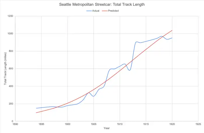 After 1888, many cities turned to electric streetcars. Within a year, electric streetcars had replaced more costly horsecars in many cities.[2] In 1889, Seattle had the first electric streetcars to replace horsecar. With the significant advantage of streetcar over horsecar, the boom starts. By 1892, which is three years after testing the first electric streetcar, Seattle had almost 50 miles of streetcar track, plus 22 miles of cable rail.[8]