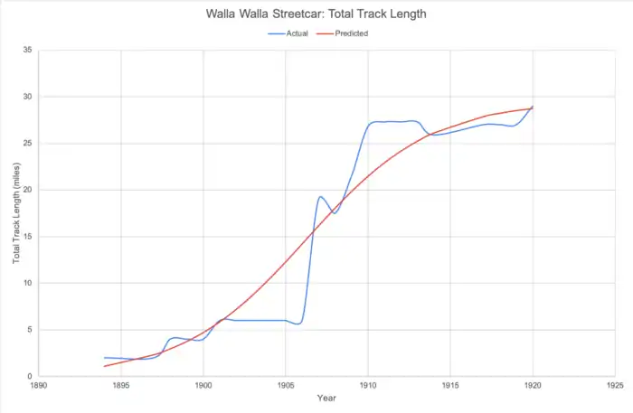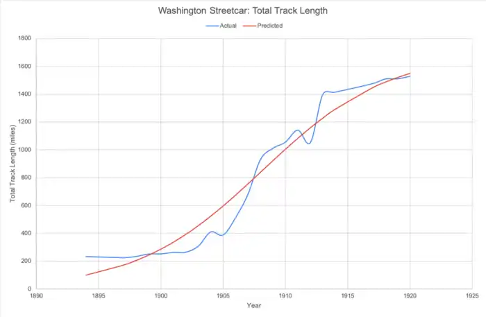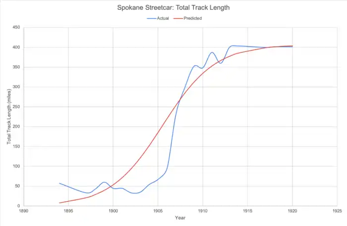 The 'McGraw Electric Railway Manual - the red book of American street railway investment' was used in order to analyze the lifecycle of streetcars in Washington from 1894 to 1920. It was expected that the total track length forms an S-curve, the S-curve model uses the three-parameter equation below: