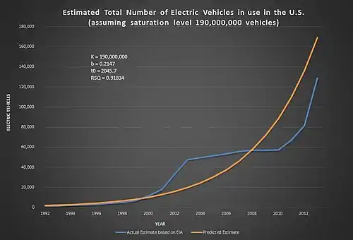 The growth experienced in the past two years seems to beat any previous trends, and technology and early success of Tesla Motors has something to do with that. There are still many hurtles to be cleared before the electric vehicle achieves widespread adoption, but the future is more promising than it has ever been. If a car company can make an affordable 200 mile range car that charges in about as much time as a gas tank, chances are very strong for full scale implementation. Based on a best curve fit (S-curve) on data relied upon by the EIA, and an assumption that all 250 million cars will be converted or replaced by electric, 2047 will be the year in which 50% of the market has been replaced.