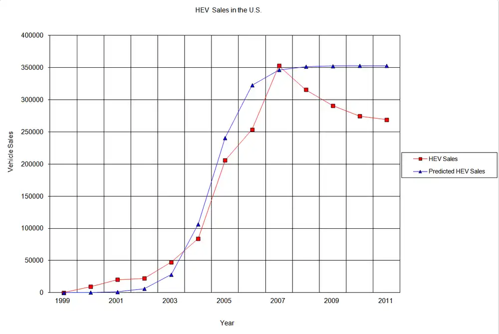 Although HEV sales can be volatile due to the various influencing factors such as fuel prices, tax credits, regulations and the economy all changing, the data between birth in 1999 and maturity in 2007 represents a fairly consistent S-curve of transportation modes. Since 2007, the decline has been somewhat different and HEVs may reach a higher peak in years to come which would greatly influence the model. However, due to the nature of growth between 1999 and 2007, the model was able to generate a fairly good fit. As data from future years comes out, the model will continue to be modified.