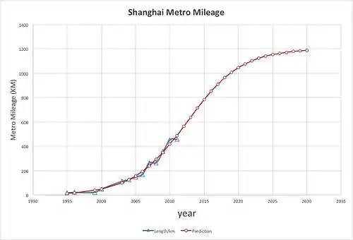 The S-Curve fits the real data pretty well. Before 1995, there was no metro line in operation. During the year 1995-2011, the network mileage was growing at an increasing speed. According to the S-Curve model, the year 2012 is the year when 1/2 K is achieved, which means that the system will still grow, but the rate is probably slowing down. Around 2030 the mileage will start to level off at around 1200 km. However we need to pay attention to this S-curve too. The network growth of Shanghai Metro so far is following the metro plan pretty well. According to the plan for next phase, the mileage is going to increase to 880 km in 2020. But on the S-Curve the estimated mileage for 2020 is higher than 1000 km already.