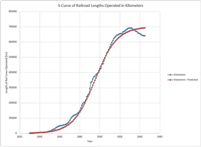 In order to analyze the data that was collected from the 1949 Historical Statistics Reference, a three-parameter logistic function was considered. Basically using and fitting an S-curve to the suggested data ultimately will provide a general picture of the transportation technology's historic life cycle of birth, growth, maturity and decline. The logistic function that was utilized was , where S(t) is the status measure, in this case, kilometers of operated railroad tracks in the United States, t is time which is in years, t0 is the inflection time which is the year in which .5*K us achieved, K being the saturation status level and b is a coefficient. K and b are to be estimated as well.