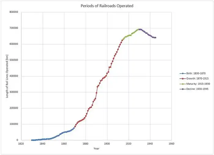 With the data that was collected, Figure 2 shows that there was an approximate 15 year period of maturity which followed an explosive 45 year growth period. It can be speculated that at about 1920 there became a saturation point in which not many new railroads were made. You begin to see a decline in the total length of tracks being operated especially when the Great Depression hit. Since more and more railroad companies were going bankrupt during this time, it made no sense whatsoever to keep line operational.