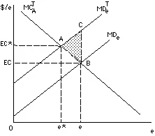 Alternatively, suppose the authority set a sub-optimal emission standard of e because it is using the erroneous MD function. With emissions at e rather than e*, we again end up with a net social loss of ABC. Therefore, uncertainty with respect to the marginal damage function provides NO ADVANTAGE to either scheme; pricing or standards.