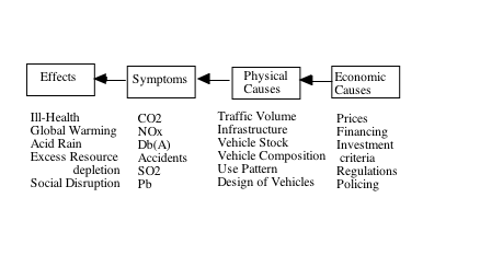 Button (1994) develops a model relating ultimate economic causes to negative externalities and their consequences as summarized in the following graphic. Users and suppliers do not take full account of environmental impacts, leading to excessive use of transport. Button argues that policy tools are best aimed at economic causes, but in reality measures are aimed at any of four stages. Here we are considering the middle stage, physical causes and symptoms, and are ignoring feedback effects.