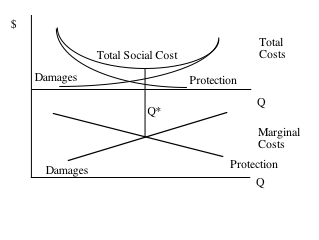 The tradeoff between benefits and costs is central to most economic analyses. Costs and benefits are both measurable and immeasurable, and a complete analysis must consider transaction and information costs as well as market costs. Individuals strive to maximize net benefits (benefits after considering costs), society might apply this to social costs as well. Reducing damages requires increasing protection (defense, abatement, or mitigation) to attenuate the damage. At some point, the cost of protection outweighs the benefit of reducing residual damages. This is illustrated in the figure. Whether this point is at zero damages (no damage is acceptable), zero protection (the damage is so insignificant as to be irrelevant), or somewhere in between is an empirical question. Total social costs are minimized where the marginal cost of additional damages equals the cost of additional protection. Whether the marginal costs of damage and of protection are fixed, rising or declining with output, and by how much will be another important empirical question.
