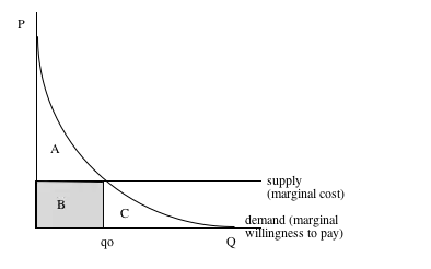 In the next Figure, area A represents the consumer surplus, or the benefit which the community receives from production, and is maximized by producing at qo (marginal cost of protection or attenuation equals the marginal cost of defense). The shaded area B represents production costs, and is the amount of social cost at the optimal level of production. Area C is non-satisfied demand, and does not result in any social costs so long as production remains at .