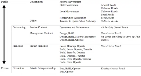 One can think of the degree of public and private involvement in the provision of transportation as falling somewhere along a continuum between fully public and fully private ownership. Returning to the example of road provision, the figure outlines the various forms of possible public and private ownership structures, along with the types of functional class roads they might apply to.