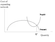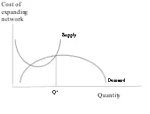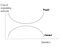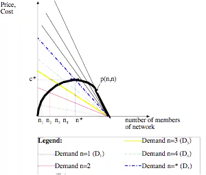 A demand curve for a typical good is downward sloping, the more it costs, the less that will be consumed. However, the demand for a network good rises with the number of members of the network (Economides 1996). Each user of the network creates a positive externality for other users. Thus, networks exhibit a seemingly upward sloping demand curve, self-limiting at saturation, with perfectly inelastic demand.
