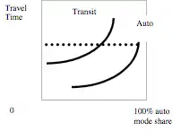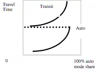 Why did the automobile take-off? Because at all values of auto-mode share, the automobile has a faster travel speed than transit, even though the city might be better off as a whole (have an overall faster speed) if the congestion from autos was avoided altogether and everyone rode the bus. Mogridge[1] and others have hypothesized that this is indeed how congested transportation systems work in the absence of charges for road access. [1]