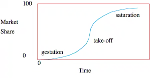 Over the long term, we expect networks to grow in the fashion of an S-Curve as discussed in the Lesson on Positive Externalities