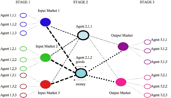 Clearly this situation is idealized. Some firms may have different degrees of vertical integration, that is they may internalize what is represented here as an input market or the output market. However, this figure does reflect that a production process may have economies of scope, so that a single firm produces for more than one output market, as is shown in Figure 1 between Stage 2 and Stage 3. In the illustration, there are three stages (1,2,3 from left to right) several markets in each stage (for instance a market for capital and a market for labor) and multiple firms in each market. Extending the chain far enough to the left and to the right, and incorporating enough of the economy, the markets connect with each other again, as the ultimate final consuming agent is the individual consuming goods and an ultimate input agent is an individual producing labor.