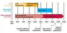 The construction of the total system is proposed to be done in phases; Step 1 - Early Investments, Statewide Benefits; Step 2 - Initial High-Speed Rail Operations; Step 3 - The Bay to Basin System; Step 4 - The Phase 1 System; and Step 5 - The Phase 2 System.