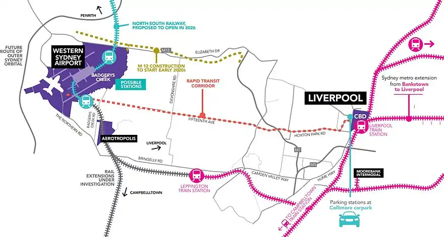 - ↑ Liverpool City Council. (2018). Rapid Transit Corridor: Liverpool CBD to Western Sydney Airport. Retrieved from: https://www.liverpool.nsw.gov.au/trim/documents?RecordNumber=180391.2018