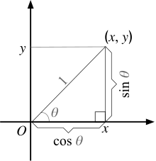 The cosine and sine functions relate the angles in right triangles as the ratio of lengths of the corresponding sides. For example, the cosine function () relates the angle theta, , from the adjacent side of the angle to the opposite side of the right angle on the right traingle (i.e. the is the ratio between the adjacent side of that angle to the hypotenuse of the right triangle).