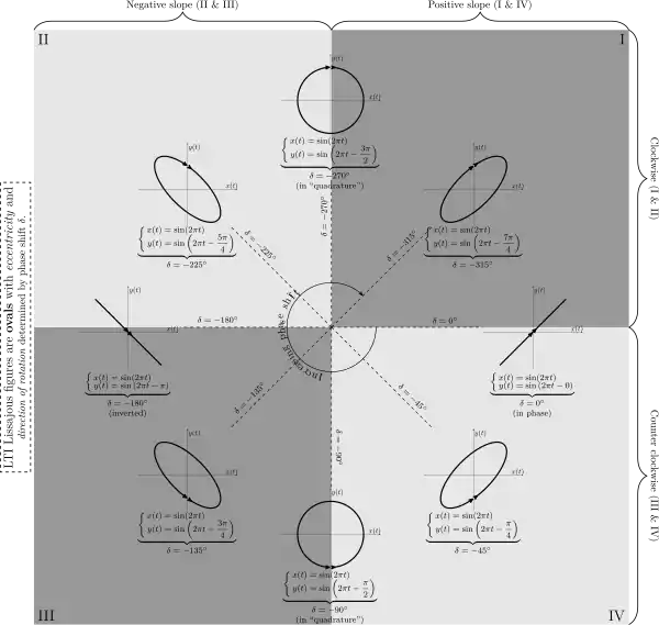 When the input to an LTI system is sinusoidal, the output is sinusoidal with the same frequency, but it may have a different amplitude and some phase shift. Using an oscilloscope that can plot one signal against another (as opposed to one signal against time) to plot the output of an LTI system against the input to the LTI system produces an ellipse that is a Lissajous figure for the special case of a = b. The eccentricity of the resulting ellipse is a function of the phase shift between the input and output, with an eccentricity of 1 corresponding to a phase shift of and an eccentricity of corresponding to a phase shift of 0 or 180 degrees. The figure below summarizes how the Lissajous figure changes over different phase shifts. The arrows show the direction of rotation of the Lissajous figure.