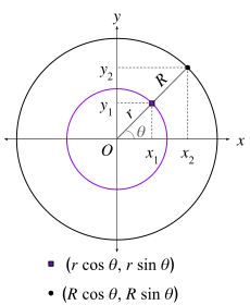Draw two circles with radii and centered at the origin, where . If a line extending from the origin reaches an endpoint of each circle at the angle , then , and . As such,
