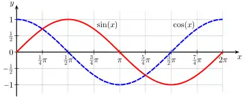 The sine and cosine curve are both graphed over the period ( with a frequency )