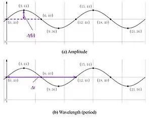 The amplitude is the maximum amount that the wave differs from the sinusoidal axis value, – the value by which the function is shifted by the average of the maximum to the minimum range of the function, . The amplitude comes from two different locations: the maximum value minus or the minimum value minus . The positive magnitude of the value is taken (absolute value). Look at the data below for an example.