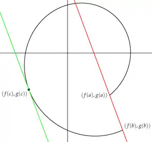 which is parallel to the line defined by the points and . However Cauchy's theorem does not claim the existence of such a tangent in all cases where and are distinct points, since it might be satisfied only for some value with , in other words a value for which the mentioned curve is stationary; in such points no tangent to the curve is likely to be defined at all. An example of this situation is the curve given by