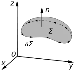 This modern form of Stokes' theorem is a vast generalization of a classical result first discovered by Lord Kelvin, who communicated it to George Stokes in a letter dated July 2, 1850.[1][2][3] Stokes set the theorem as a question on the 1854 Smith's Prize exam, which led to the result bearing his name.[3][4] This classical Kelvin–Stokes theorem relates the surface integral of the curl of a vector field F over a surface Σ in Euclidean three-space to the line integral of the vector field over its boundary ∂Σ: