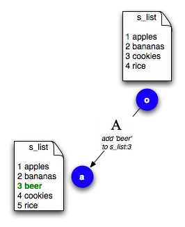 When Arjan records this change (adding beer), we produce a patch which tells us not only what contents Arjan added ("beer") but where he added them, namely to line 3 of s_list. We can say that in his repository, we have moved from context to context via a patch A. We can write this using a compact notation like or using the graphical representation below: